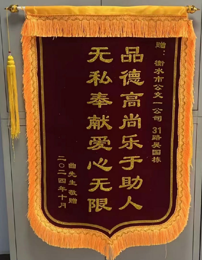 10月8日,一位市民帶著一面“品德高尚樂(lè)于助人 無(wú)私奉獻(xiàn)愛心無(wú)限”的錦旗來(lái)到衡水公交一分公司,對(duì)31路車長(zhǎng)的暖心之舉表示感謝。