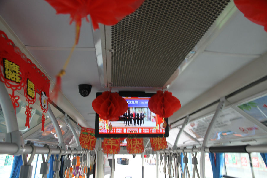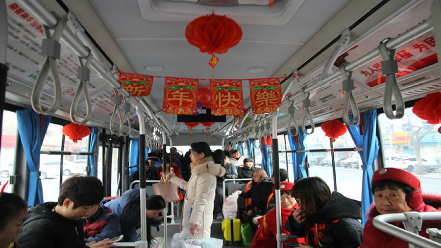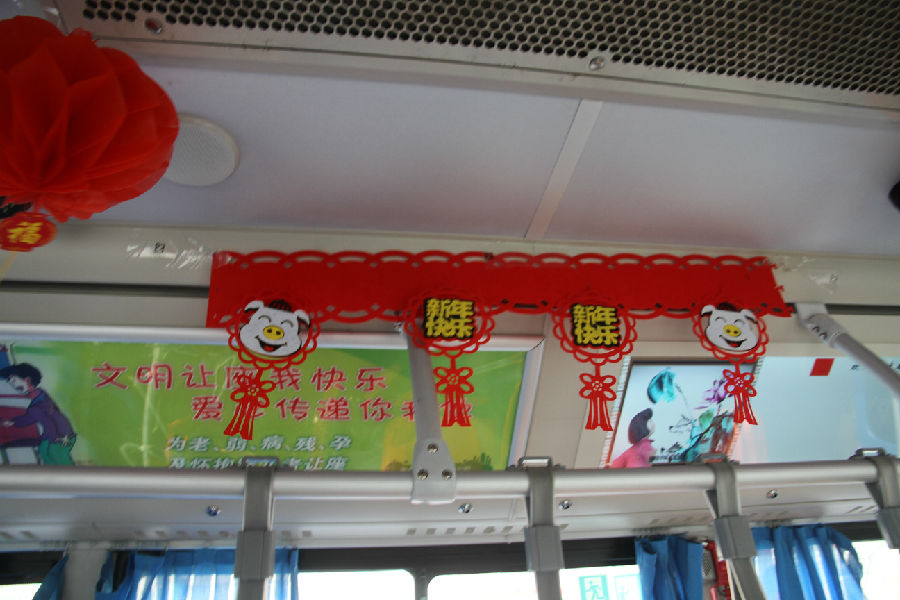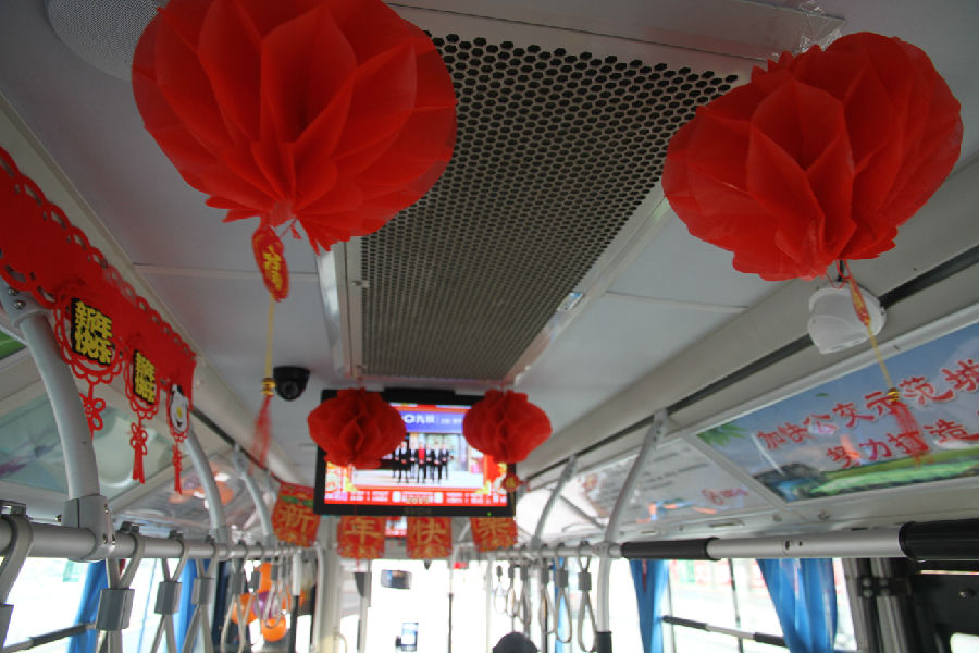 除夕當(dāng)天,不少乘坐十八路公交車的乘客發(fā)現(xiàn),車廂內(nèi)與以往有了很大的變化,火紅的小燈籠、頑皮的卡通形象、喜慶的中國結(jié)、暖暖的新春祝福......車廂內(nèi)掛滿了大大小小的裝飾物,充滿了濃濃的年味,伴隨著乘客臉上洋溢著驚喜的笑容,無不映襯著過年的喜慶氣氛,有的乘客還在拿著手機(jī)拍照。