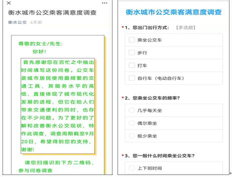 一是自8月21日至9月20日在“衡水公交微信公眾”發(fā)布“乘客滿意度和征求提高公交實(shí)載率調(diào)查問卷活動(dòng)”,市民可通過掃描識(shí)別“衡水城市公交乘客滿意度調(diào)查”二維碼,參與問卷調(diào)查。