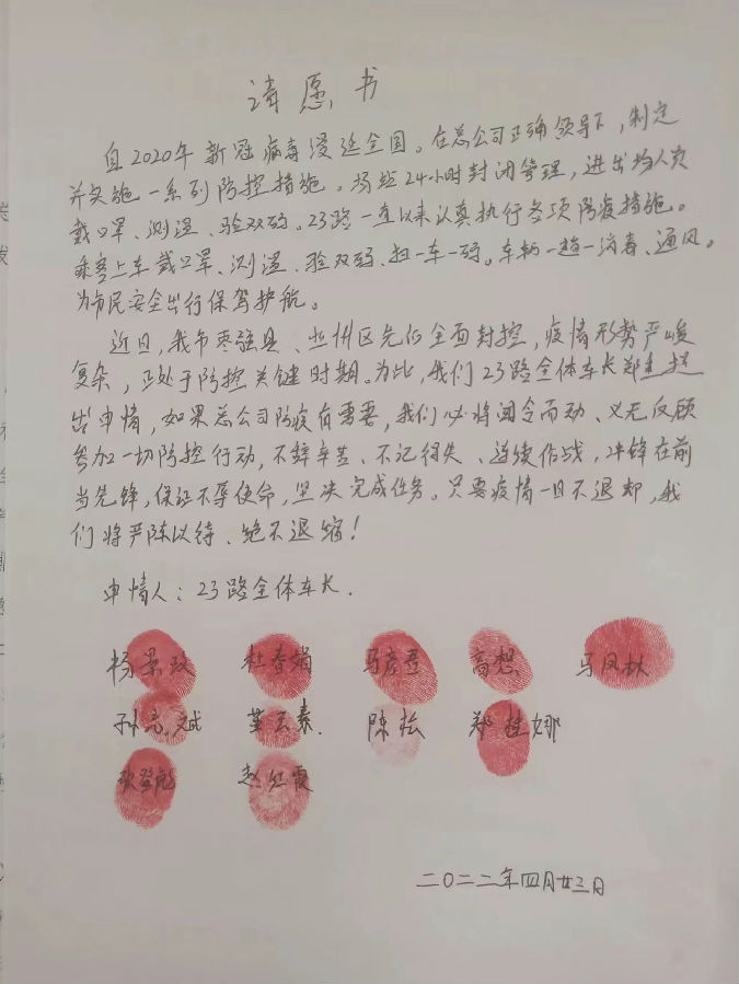 近期,我市棗強(qiáng)縣與冀州區(qū)先后實(shí)施全域封控管理,疫情就在身邊,面對如此嚴(yán)峻形勢,衡水公交23路隊(duì)長楊景政立即萌生出“與疫情共進(jìn)退,堅(jiān)守抗疫一線,時(shí)刻聽從組織召喚”的想法。4月23日晚收車后他召開路隊(duì)會議,會議上他的想法得到了路隊(duì)全體車長紛紛響應(yīng),于是一封按滿紅手印的聯(lián)名“請?jiān)笗边f交到了衡水公交總公司。