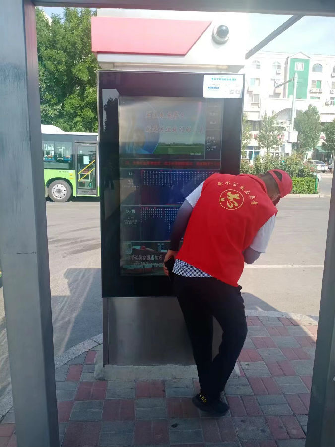 志愿者擦洗重要公交樞紐站站亭,進(jìn)一步提升公交候乘環(huán)境。