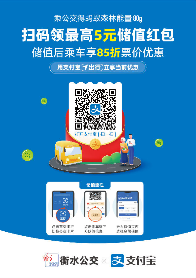 綠色出行,你我同行,為積極踐行綠色出行發(fā)展理念,7月19日起,衡水市公共交通總公司推出優(yōu)惠乘車——支付寶端“衡水電子公交儲值卡”正式投入使用,我市城市公交(含市內(nèi)所有公交線路及冀州城鄉(xiāng)公交61路--66路)線路,支持“衡水電子公交儲值卡”掃碼乘車,活動期間,掃碼開通衡水電子公交儲值卡可享受0.5-5元隨機立減優(yōu)惠,乘車更可享受票價8.5折優(yōu)惠。